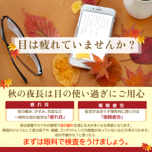 秋は、読書やスマートフォンの長時間の使用で目の疲れを感じる方が多くなります。目の痛み、かすみ、充血など不調を感じた場合は、眼科で検査を受けましょう。視力低下、メガネ、コンタクトレンズの度数があっているかどうか確認もできますので、お気軽にご受診ください。当院は、土日祝日も診療しています。